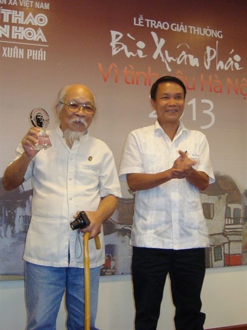 | Le photographe Quang Phùng (à gauche) reçoit le "Grand prix pour l’amour de Hanoi". |