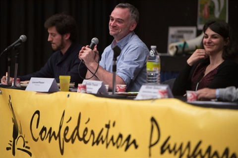 | Le porte-parole de la Confédération paysanne française, Laurent Pinatel (centre), le 13 avril 2017 à Muzillac. |