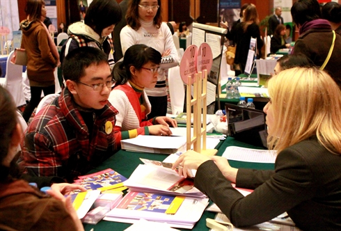 | Des élèves vietnamiens se renseignent sur des cours de formations en Grande-Bretagne lors d'une exposition à Hanoi. Photo : Bich Ngoc/VNA/CVN |