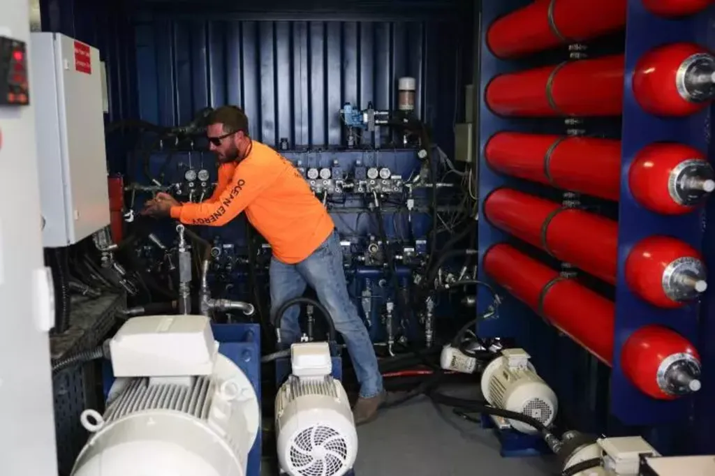 Reliés à des pistons hydrauliques, ils poussent un fluide biodégradable jusqu'à un conteneur rempli d'accumulateurs, ressemblant à de grosses bouteilles de plongée. Lorsque ceux-ci relâchent la pression, ils actionnent une turbine qui génère du courant électrique.