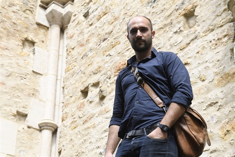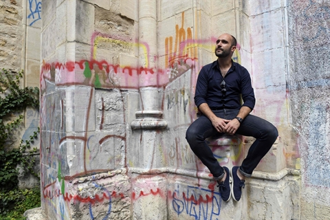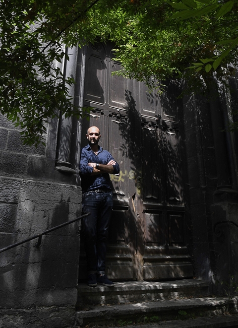 | Damien Beaufils, devant l'église Saint-Bernard, dont il s'est vu confier l'aménagement, dans le quartier lyonnais de "La Croix Rousse", le 5 juillet. |