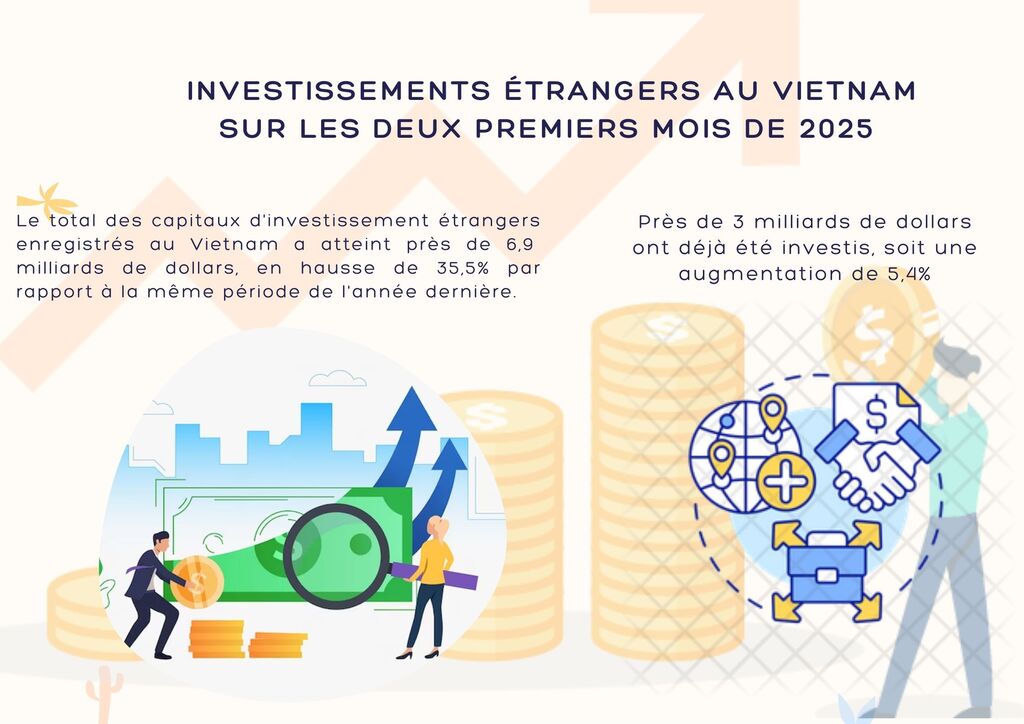 Selon les données du Bureau des statistiques du ministère des Finances, au cours des deux premiers mois de 2025, le capital enregistré des investissements directs étrangers (IDE) au Vietnam a atteint près de 6,9 milliards USD, soit une augmentation impressionnante de 35,5% par rapport à la même période de l’année précédente. Le capital effectivement réalisé a atteint près de 3 milliards USD, en hausse de 5,4%. Cela démontre l’attractivité du marché vietnamien.