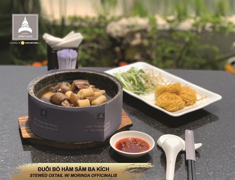L’une des spécialités préférées de nombreux clients exigeants de l’hôtel Grand Saigon ces dernières années est la queue de bœuf cuite au ginseng blanc d’An Giang (delta du Mékong). Connu pour ses effets stimulants, le ginseng est également une plante médicinale, aidant à drainer les reins et à stimuler l’appétit. Pour la préparation de ce plat, le chef de Grand Saigon a habilement associé cette plante à de la queue de bœuf, qui doit mijoter pendant deux heures pour créer un bouillon sucré, contribuant à augmenter le goût caractéristique et à retenir de nombreux nutriments.