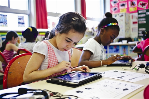 | Des écoliers britanniques utilisent des Ipad en cours. |
