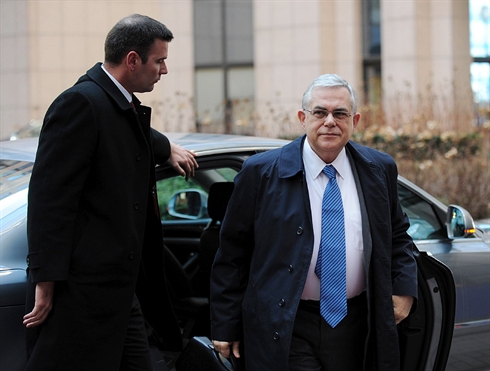 | Le Premier ministre grec Lucas Papademos (droite) arrive à la réunion de l'Eurogroupe, le 20 février à Bruxelles. |