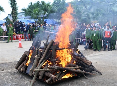 | Incinération d'ivoires et de cornes de rhinocéros saisis lors de plusieurs affaires de commerce illégal à Hanoï. Photo: Vu Sinh/VNA/CVN |