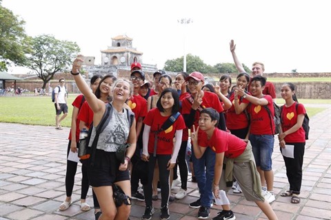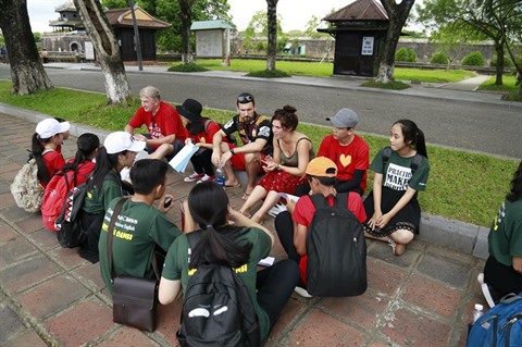 | Les élèves rencontrent des touristes natifs dans la cité impériale de Huê pour pratiquer l’anglais. |