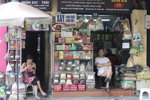 | Une femme et un homme devant leurs maisons étroites dont les façades servent de magasins de plantes médicinales traditionnelles dans le vieux quartier de Hanoï. |