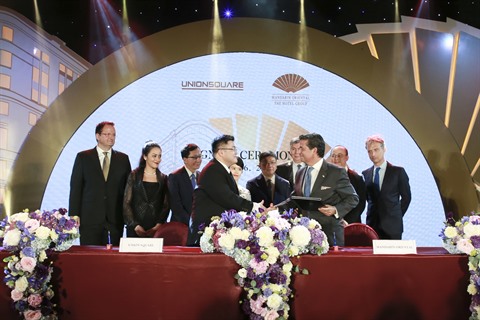 | Cérémonie de signature de la coopération entre le groupe hôtelier Mandarin Oriental et Union Square Saigon. |