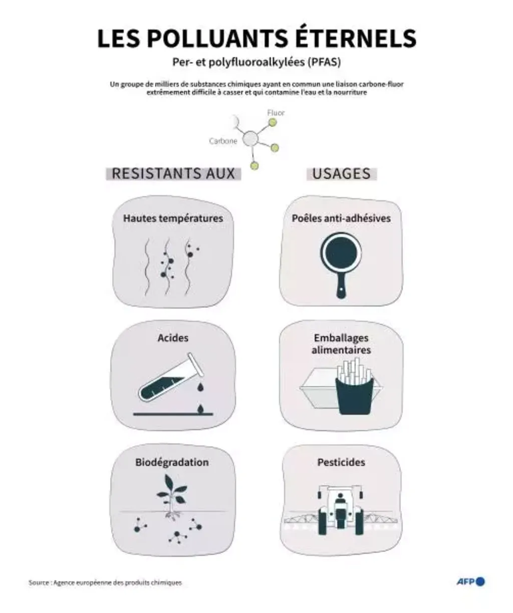Ces molécules chimiques per- et polyfluoroalkylées (PFAS), abondamment utilisées dans l'industrie et la fabrication d'objets de grande consommation, contaminent ensuite eaux et sols, et laissent craindre des effets délétères pour la santé selon plusieurs études : augmentation du taux de cholestérol, cancers, effets sur la fertilité et le développement du fœtus, notamment.