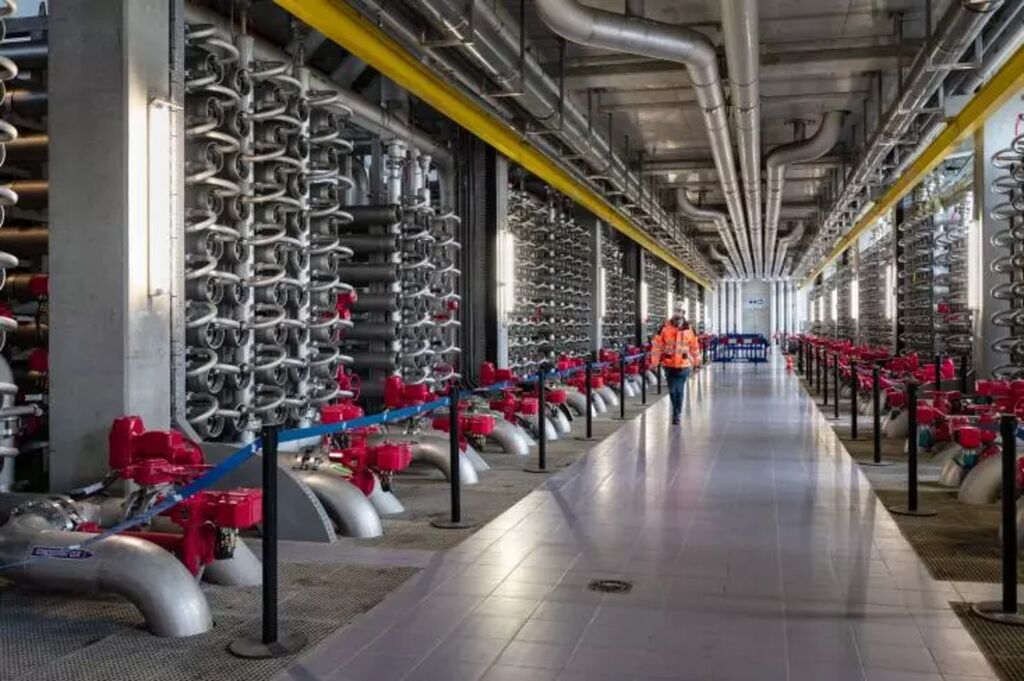 | Vue générale de la galerie centrale de nanofiltration de l'usine de production d'eau potable de Méry-sur-Oise, dans le Val-d'Oise. |