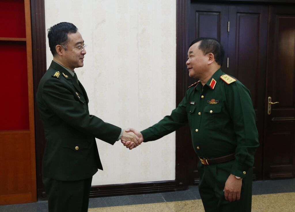 | Le général de corps d'armée Hoàng Xuân Chiên (droite), vice-ministre de la Défense et le colonel Pan Tao, attaché de défense de Chine au Vietnam, le 28 mars à Hanoï. |