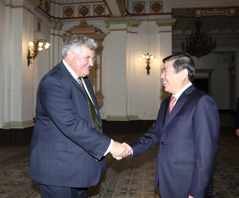 | Le président du Comité populaire de HCM-Ville, Nguyên Thanh Phong (droite), reçoit le 19 octobre le ministre bulgare de l’Économie, Bojidar Loukarsky. |
