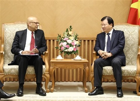 | Le vice-Premier ministre Trinh Dinh Dung (droite) et Ranjit Lamech, directeur régional du Département des infrastructures de la Banque mondiale dans la région Asie de l'Est et Pacifique. |