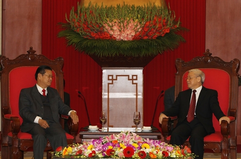| Le secrétaire général du Parti communiste du Vietnam, Nguyên Phu Trong (droite), et le vice-Premier ministre et président du sous-comité de coopération Laos-Vietnam, Somsavad Lengsavath, le 22 janvier à Hanoi. |