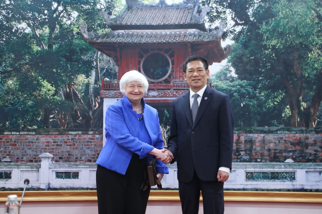 | Le ministre des Finances, Hô Duc Phoc, et la secrétaire américaine au Trésor, Janet Yellen, le 21 juillet à Hanoï. |