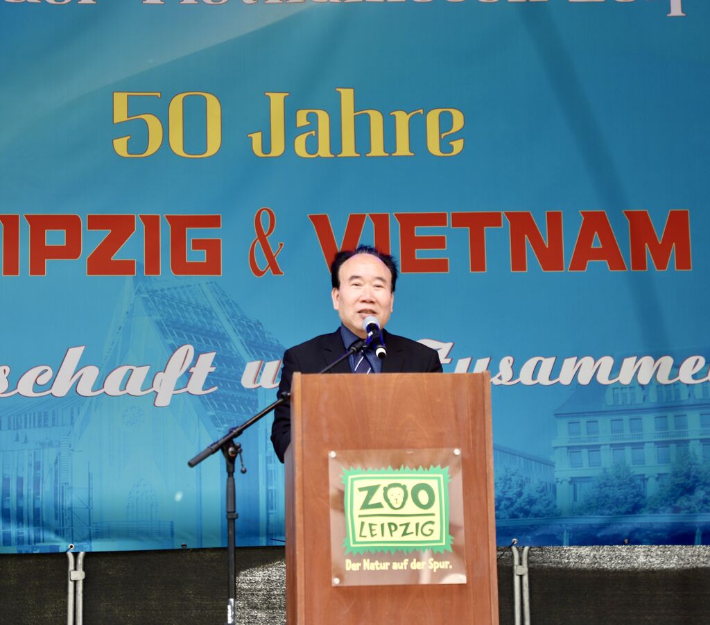 | Le président de l'Association des Vietnamiens de Leipzig, Bùi Quang Huy, s'exprime lors de l'événement. |