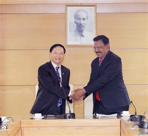 | Le vice-président de l'Union des organisations d'amitié du Vietnam, Bùi Khac Son (gauche), reçoit le secrétaire général de l'ISCUF, K. Subramanian. |