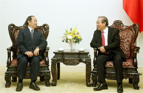 | Le vice-Premier ministre Truong Hoà Binh (droite) et le président de la Cour populaire suprême du Laos, Khampha Sengdara, 15 juillet à Hanoï. |