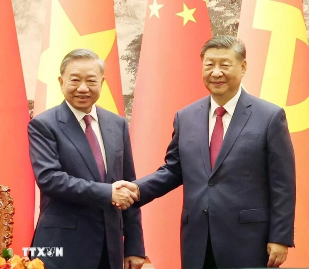 | Le secrétaire général du Comité central du PCC et président chinois, Xi Jinping (droite), et le secrétaire général du Comité central du PCV, Tô Lâm. |