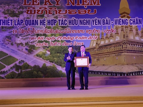 | Le chef de la province de Vientiane Vidong Xaynhasone (droite) a reçu l'Ordre de l'Indépendance de deuxième classe en l'honeur du 10e anniversaire de l'établissement des relations de coopération entre la province de Yên Bai et Vientiane. |