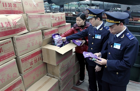 | Contrôle de marchandises importées à la porte-frontière de Mong Cai (province de Quang Ninh, Nord). |