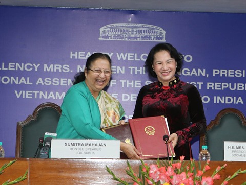 | Nguyên Thi Kim Ngân (droite) et Sumitra Mahajan lors de la cérémonie de signature d'un accord de coopération entre l'AN vietnamienne et la Chambre du peuple d'Inde. |