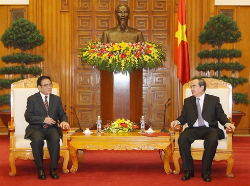 | Le vice-Premier ministre Nguyên Thiên Nhân (droite) et le président de l'Association d'amitié Chine-Vietnam, Qi Jianguo, le 14 octobre à Hanoi. |