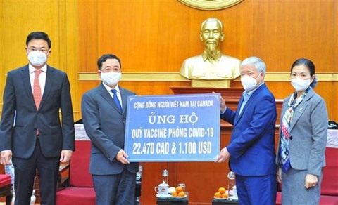 | Le président du Comité du Front de la Patrie du Vietnam, Dô Van Chiên, (2e droite) reçoit le don de la communauté vietnamienne au Canada pour soutenir la prévention et le contrôle de l'épidémie. |