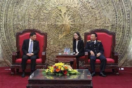 | Le directeur du Département général des Douanes, Nguyên Van Cân (droite), s'entretien avec le secrétaire général de l’Organisation mondiale des douanes, Kunio Mikuriya, le 7 mars à Hanoï. |