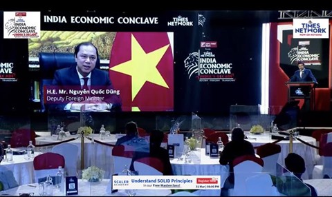 | Le vice-ministre des Affaires étrangères Nguyên Quôc Dung lors d'une conférence économique de l’Inde 2021 en ligne, le 26 mars. |