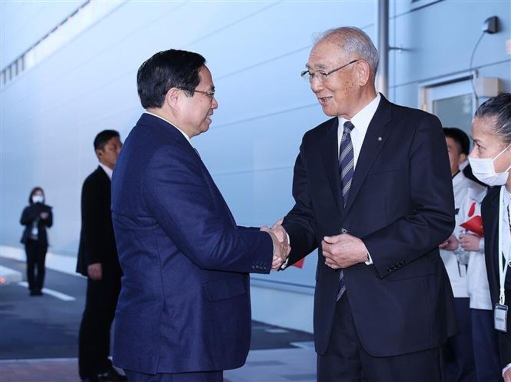 | Le Premier ministre Pham Minh Chinh (gauche) serre la main à un dirigeant de la société Shibata Gousei, le 15 décembre au Japon. |