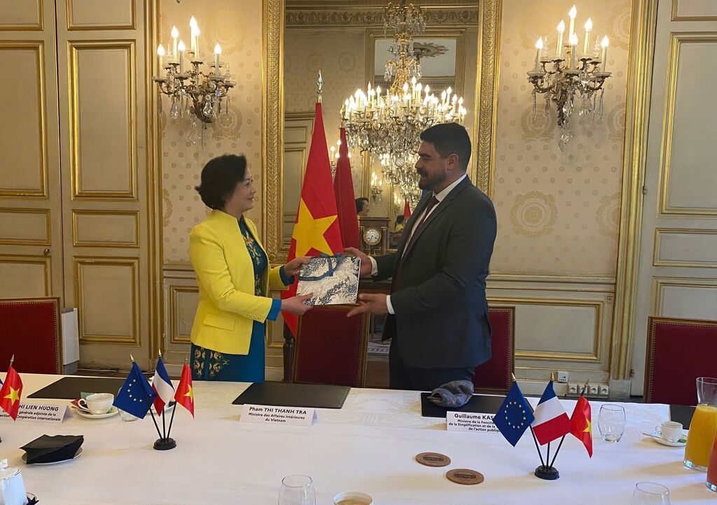 | Le ministre français de la Fonction publique, de la Simplification et de la Transformation de l'action publique, Guillaume Kasbarian, et la ministre vietnamienne de l'Intérieur, Pham Thi Thanh Trà, signent un accord administratif entre les deux ministères. |