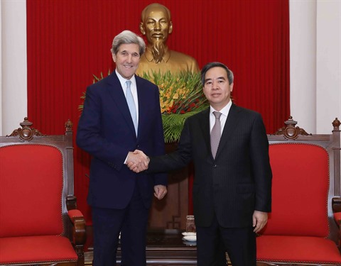 | Le chef de la Commission centrale de l’économie du PCV, Nguyên Van Binh (droite), et l’ancien secrétaire d’État américain John Kerry. |