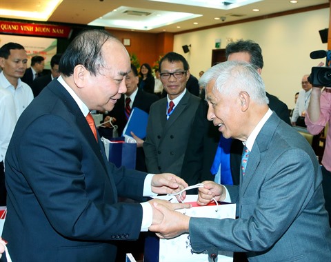 | Le premier ministre Nguyên Xuân Phuc offre les cadeaux aux Viêt kiêu. |