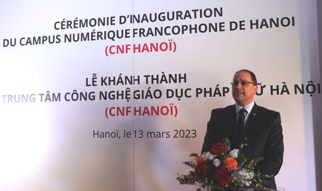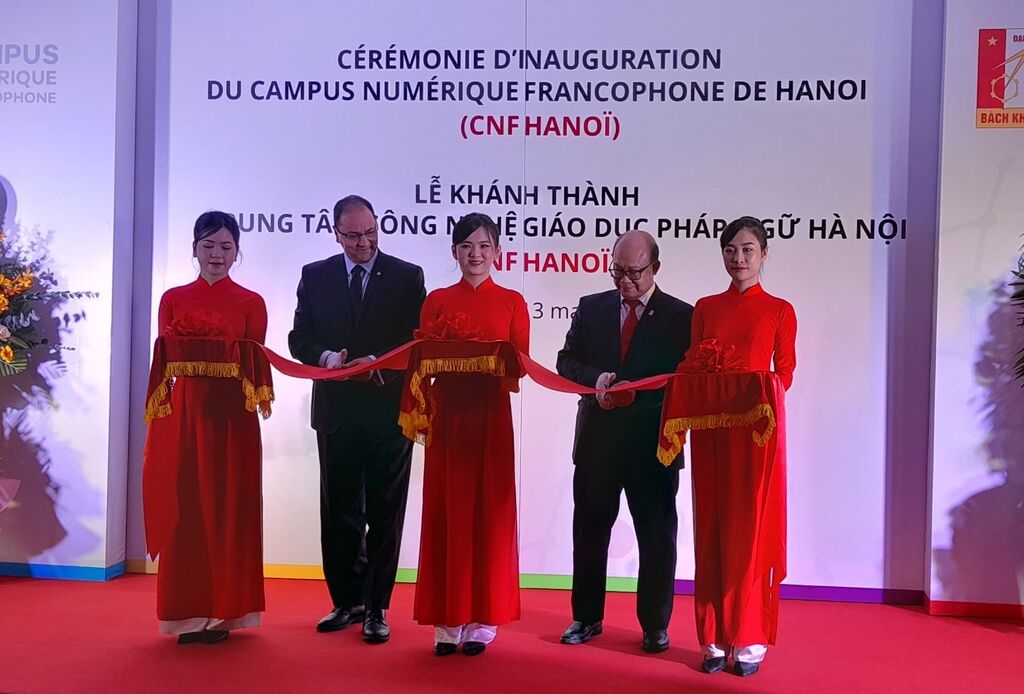 Le recteur et la vice-rectrice de l’Agence universitaire de la Francophonie (AUF), le Professeur Slim Khalbous et la Professeure Marie Nathalie Le Blanc, ont participé le 13 mars à la cérémonie d’inauguration du premier Campus numérique francophone à Hanoï (CNF Hanoï), situé à l’Université des sciences et technologies de Hanoï (École polytechnique de Hanoï).