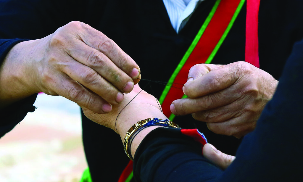 | Rite de l’attache des fils rouges autour du poignet des Thai blancs. |
