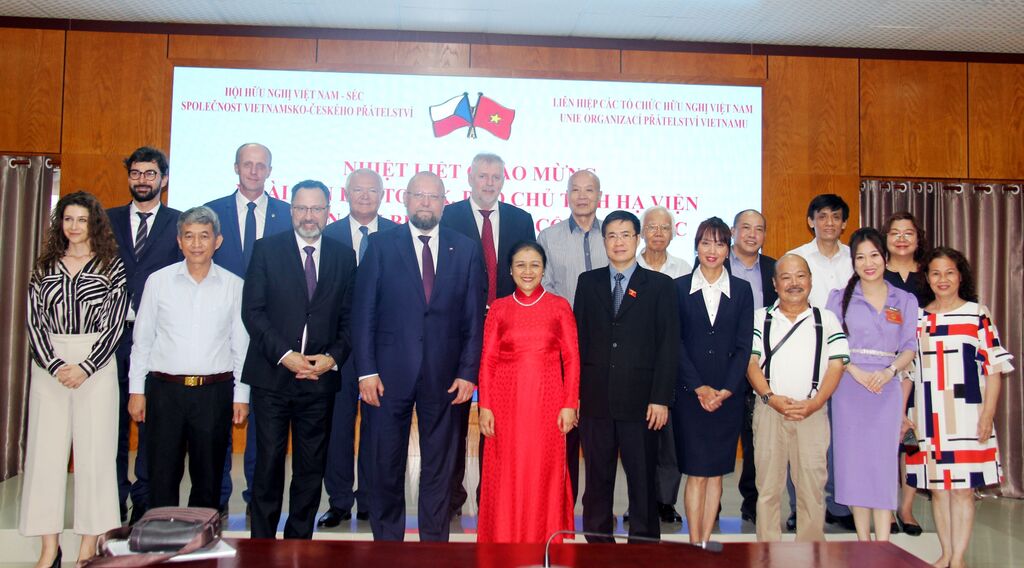 | La présidente de l'Union des organisations d'amitié du Vietnam, Mme l'ambassadeur Nguyên Phuong Nga (áo dài rouge), et le vice-président de la Chambre des députés de la République tchèque (premier rang, 4e à droite), Jan Bartosek. |