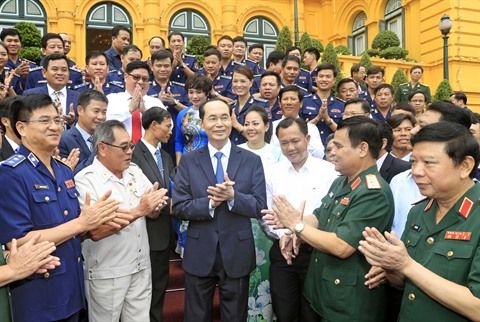 | Le président Trân Dai Quang (premier plan, centre) pose avec les cadres et soldats exemplaires de la garde-côte. |
