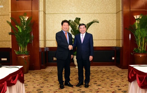 | Le président du Comité populaire de Hô Chi Minh-Ville, Nguyên Thành Phong (droite), a reçu le 20 mai, le maire de la ville de Daegu, Kwon Young-jin. |