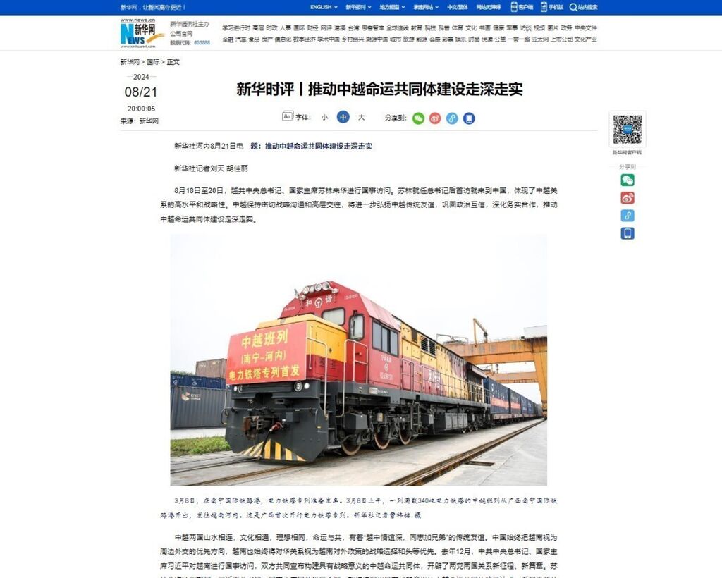 L'Agence de presse Xinhua a publié le 21 août un article intitulé "Promouvoir la construction d'une communauté d'avenir partagé Chine - Vietnam de manière de plus en plus profonde et substantielle", soulignant que le choix du secrétaire général du Parti communiste du Vietnam et président de la République, Tô Lâm, de la Chine comme premier pays à visiter peu après sa prise de fonction reflète le niveau élevé et la nature stratégique des relations Vietnam - Chine.