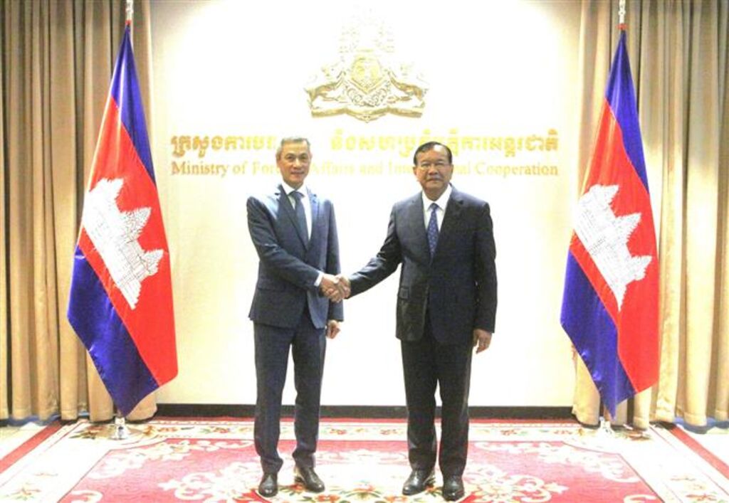 | Le vice-Premier ministre et ministre des Affaires étrangères et de la Coopération internationale Prak Sokhonn (droite) reçoit l'ambassadeur vietnamien Nguyên Minh Vu. |