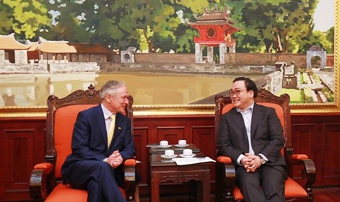 | Le secrétaire du Comité du Parti de Hanoï, Hoàng Trung Hai (droite), reçoit le ministre irlandais de l’Éducation et des Compétences, Richard Bruton, à Hanoï. |