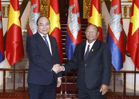 | Le Premier ministre Nguyên Xuân Phuc (gauche) reçoit le 24 juin, à Hanoï, le président de l'Assemblée nationale (AN) du Cambodge Samdech Heng Samrin, en visite officielle au Vietnam |