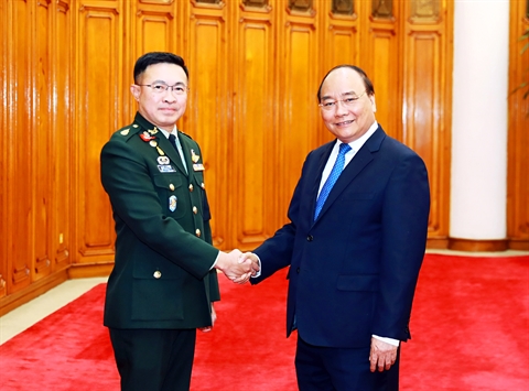 | Le Premier ministre vietnamien Nguyên Xuân Phuc (droite) et le général Surapong Suwana-Adth, commandant en chef des Forces thaïlandaises de défense, le 5 avril à Hanoï. |