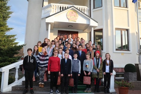 | Photo de famille de la délégation de 40 enseignants et élèves de la ville de Kremenchuk devant l'ambassade du Vietnam en Ukraine. |