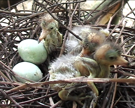 | Nid de héron avec des jeunes tout juste éclôts. |