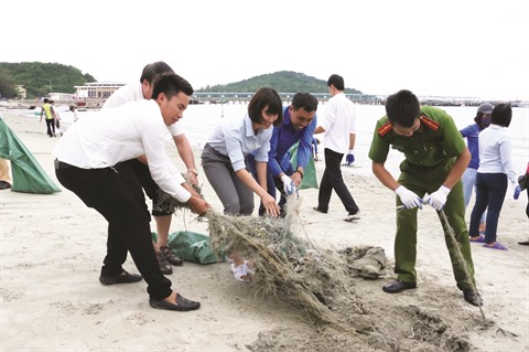 | Ramassage des ordures sur la plage de Cô Tô, dans la province de Quang Ninh (Nord). |