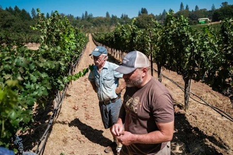 | Randy Dunn (gauche) et son fils inspectent leurs vignes à deux semaines du début de la récolte, espérant qu'un nouvel incendie ne viendra pas ruiner la récolte comme en 2020. |