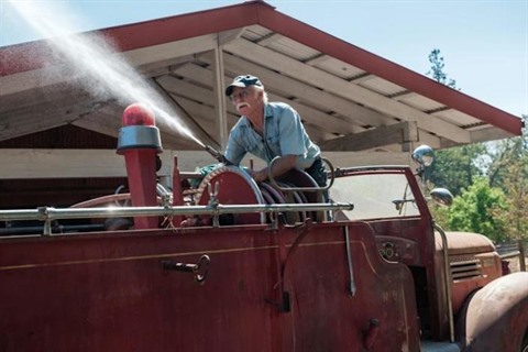 | Randy Dunn teste la pression du tuyau de son camion de pompiers de 1946, un des remparts possibles en cas de feu dans son vignoble. |